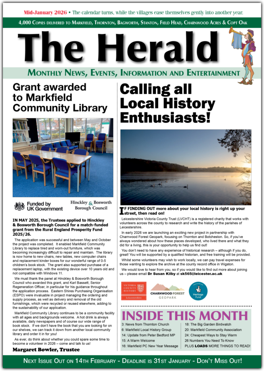 The Herald is a news and information magazine delivered 11 times a year to approximately 4,000 homes and businesses in Markfield, Thornton, Bagworth, Stanton-under-Bardon and Field Head areas of Leicestershire in the UK. The estimated readership is 8,000 people.