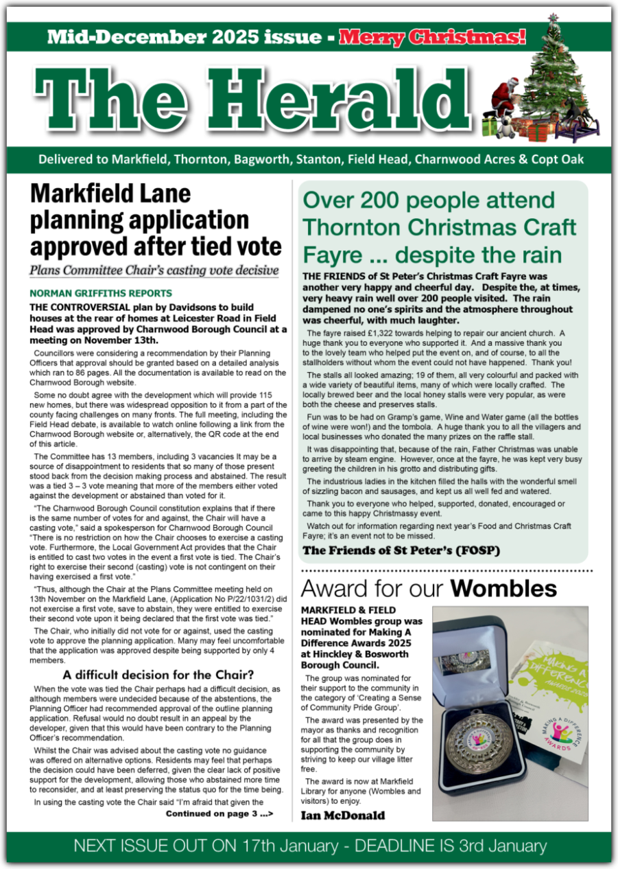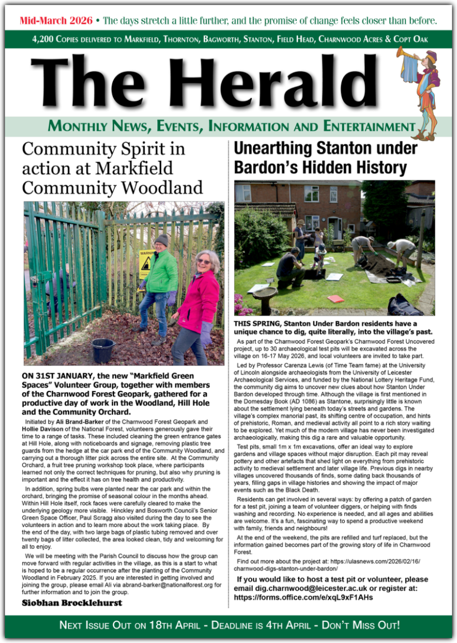 The Herald is a news and information magazine delivered 11 times a year to approximately 4,000 homes and businesses in Markfield, Thornton, Bagworth, Stanton-under-Bardon and Field Head areas of Leicestershire in the UK. The estimated readership is 8,000 people.